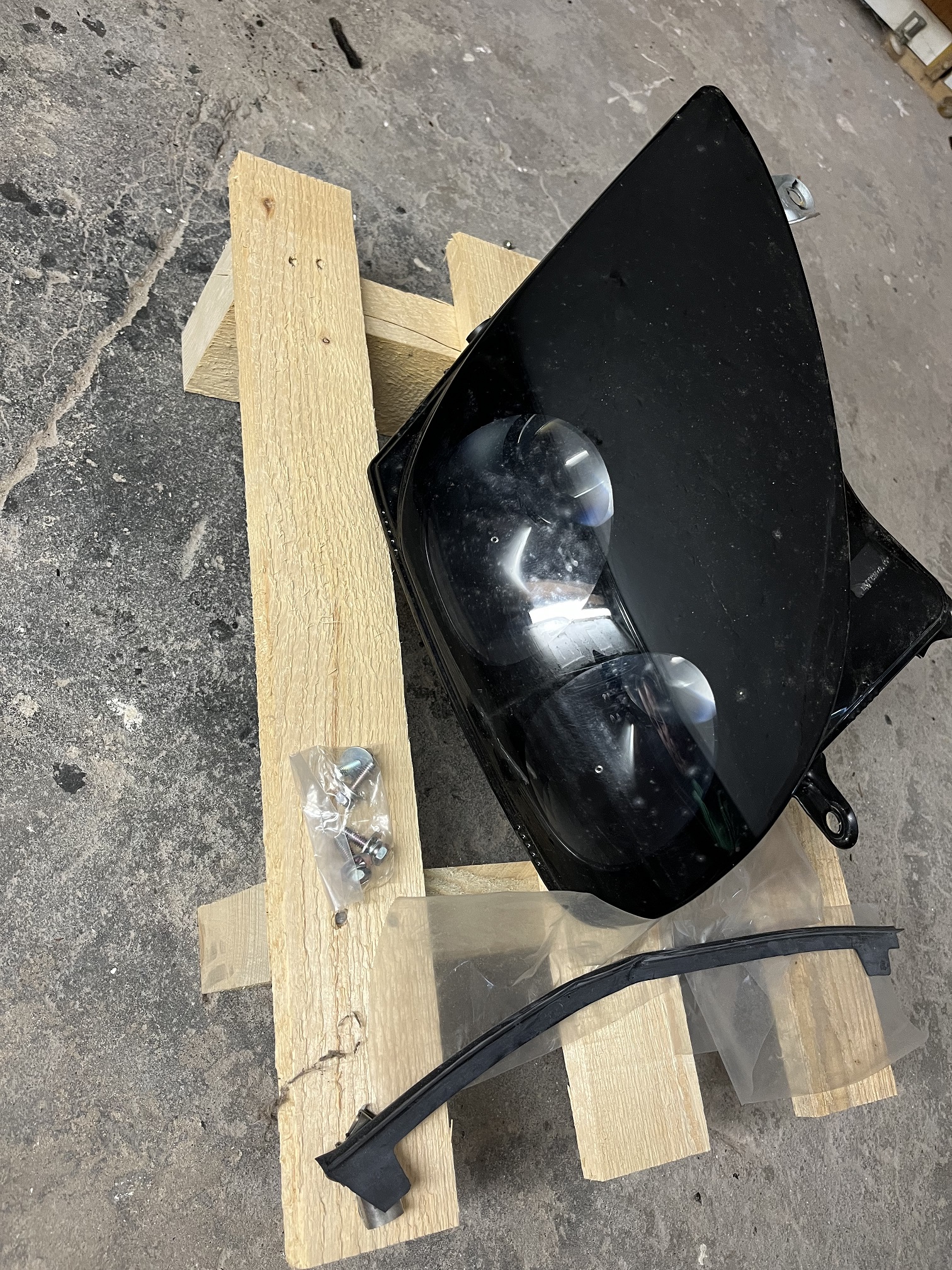 Scheinwerfer Fahrerseite in schwarz mit Dichtgummi + Befestigungsschrauben.